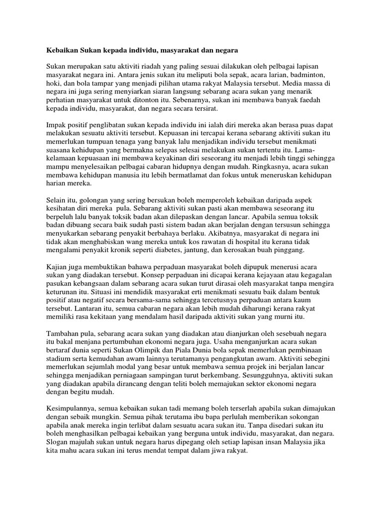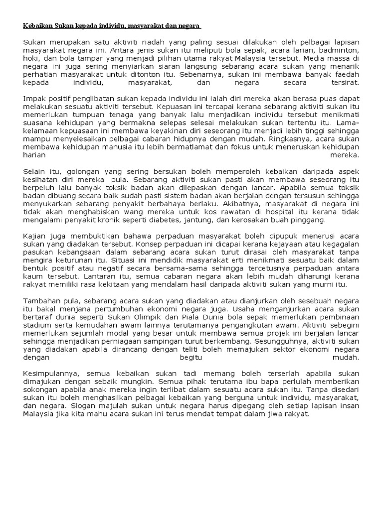 Karangan Spm Manfaat Bersukan Kepada Individu Dan Negara